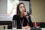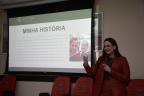 A primeira palestra da noite foi conduzida pela professora Gabriela da Silva, deficiente visual, que atua na Rede Municipal de Educação. Gabriela compartilhou suas experiências profissionais, na Educação Infantil, e pessoais, com seus dois filhos.