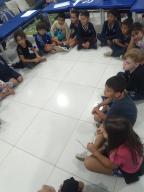 Os alunos da turma 13, do 1º ano da EMEF Olavo Bilac participaram da Dinâmica do Papel Amassado, proposta de estratégia lúdica e reflexiva para abordar o tema do combate ao bullying no ambiente escolar.